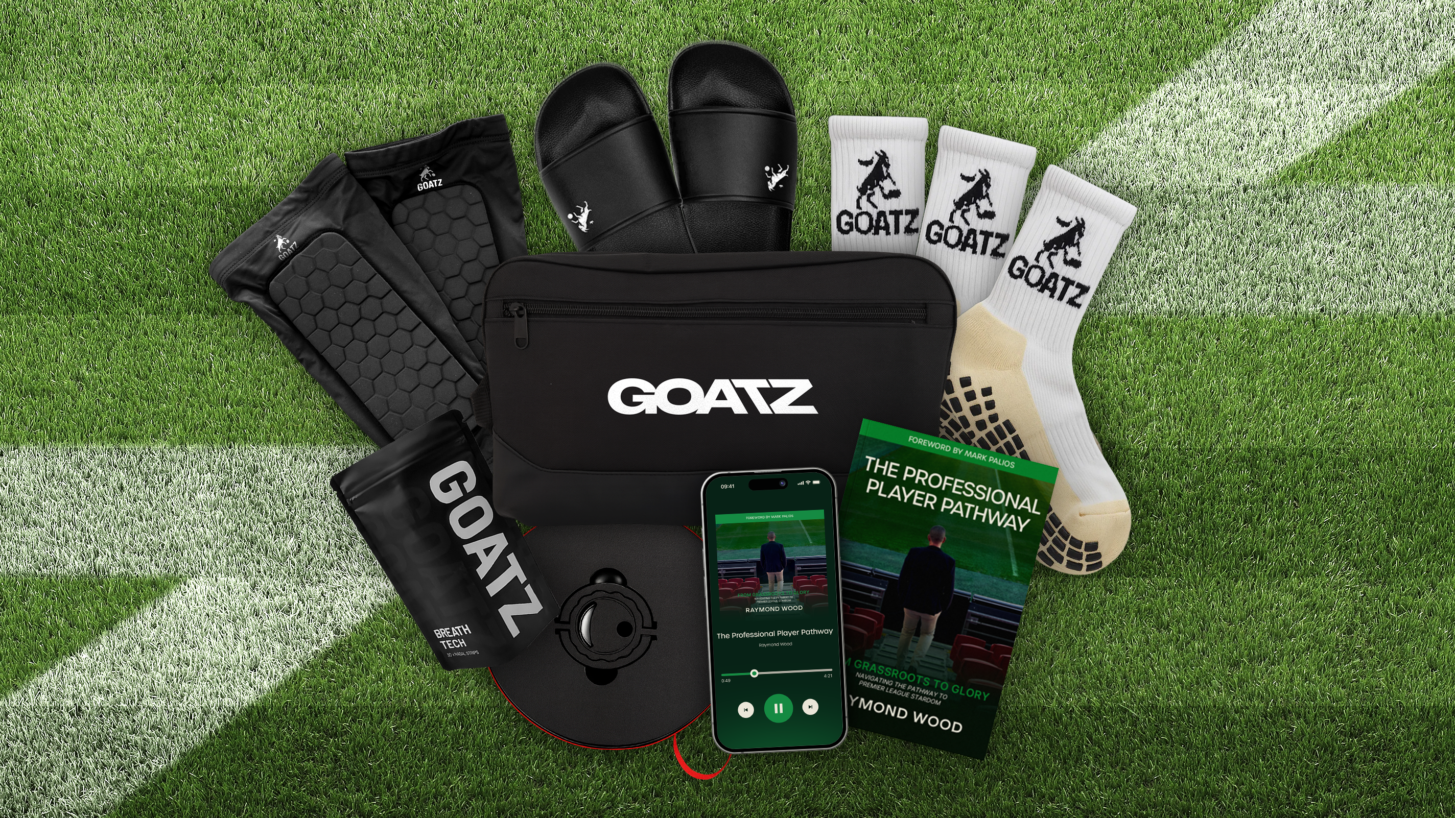 1 x GOATZ Shin Guards, 3 x GOATZ Grip Socks, Boot Bag, Foldable Stool, Slides, Breath Tech Pack, PPP eBook and Audio Book